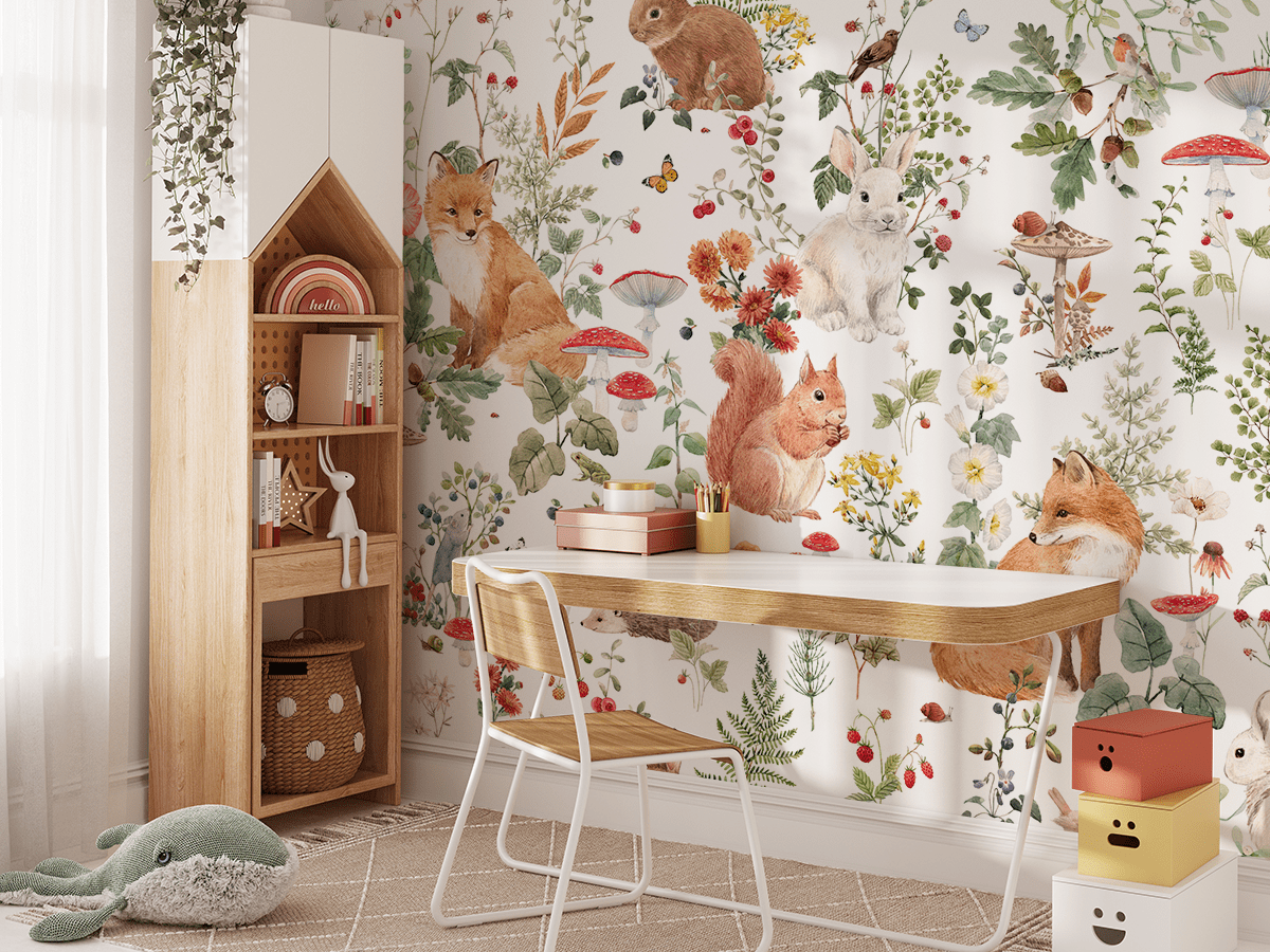 Verander de kinderkamer in een betoverd land met het fotobehang “Tussen paddenstoelen en bloemen”. Dit charmante patroon zit vol vrolijke dieren, kleurrijke bloemen en bospaddenstoelen die de fantasie van kinderen prikkelen en hen aanmoedigen de wereld van de natuur te ontdekken.