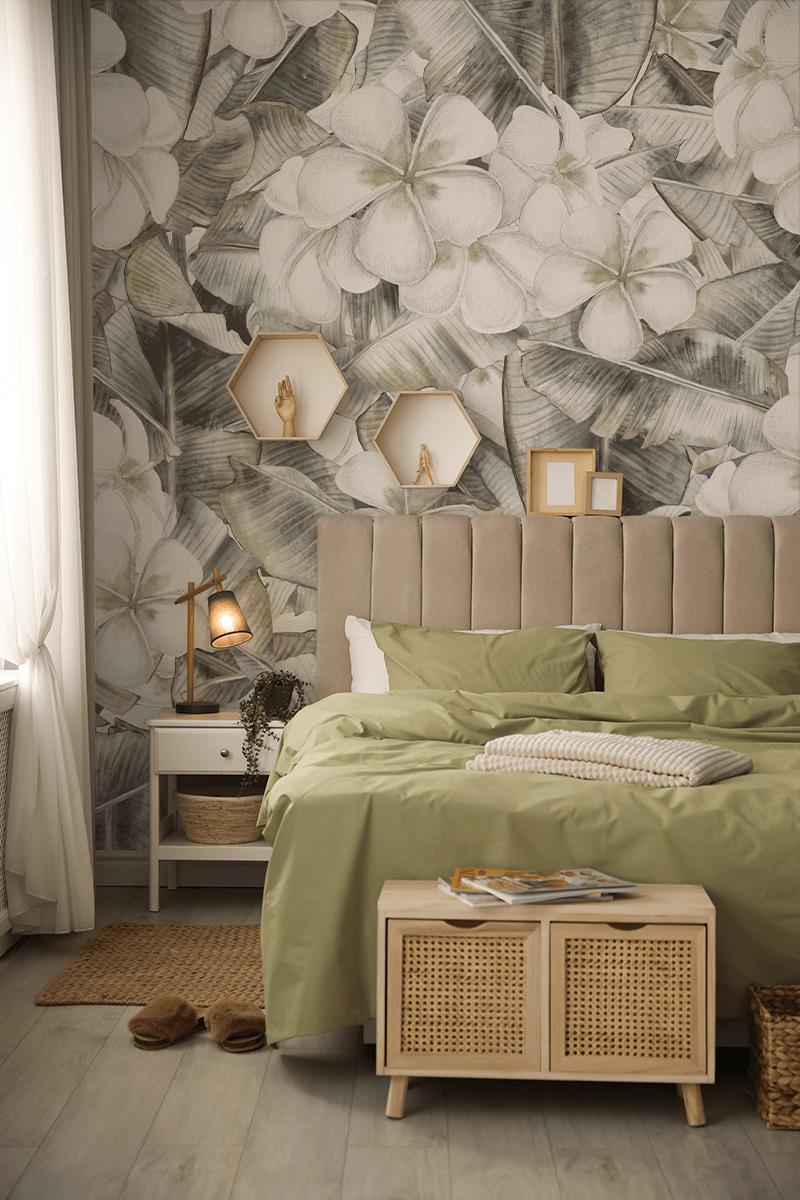 Breng een vleugje frisheid en rust in huis met het “White Blossom” fotobehang. Dit betoverende, botanische patroon, vol witte bloemen en groene bladeren, creëert een harmonieuze, natuurlijke sfeer die elke ruimte zal verlevendigen. De delicate pasteltinten en de zorgvuldige details van het patroon roepen een kalme, subtiele sfeer op, perfect geschikt voor Scandinavische, minimalistische of klassieke interieurs.