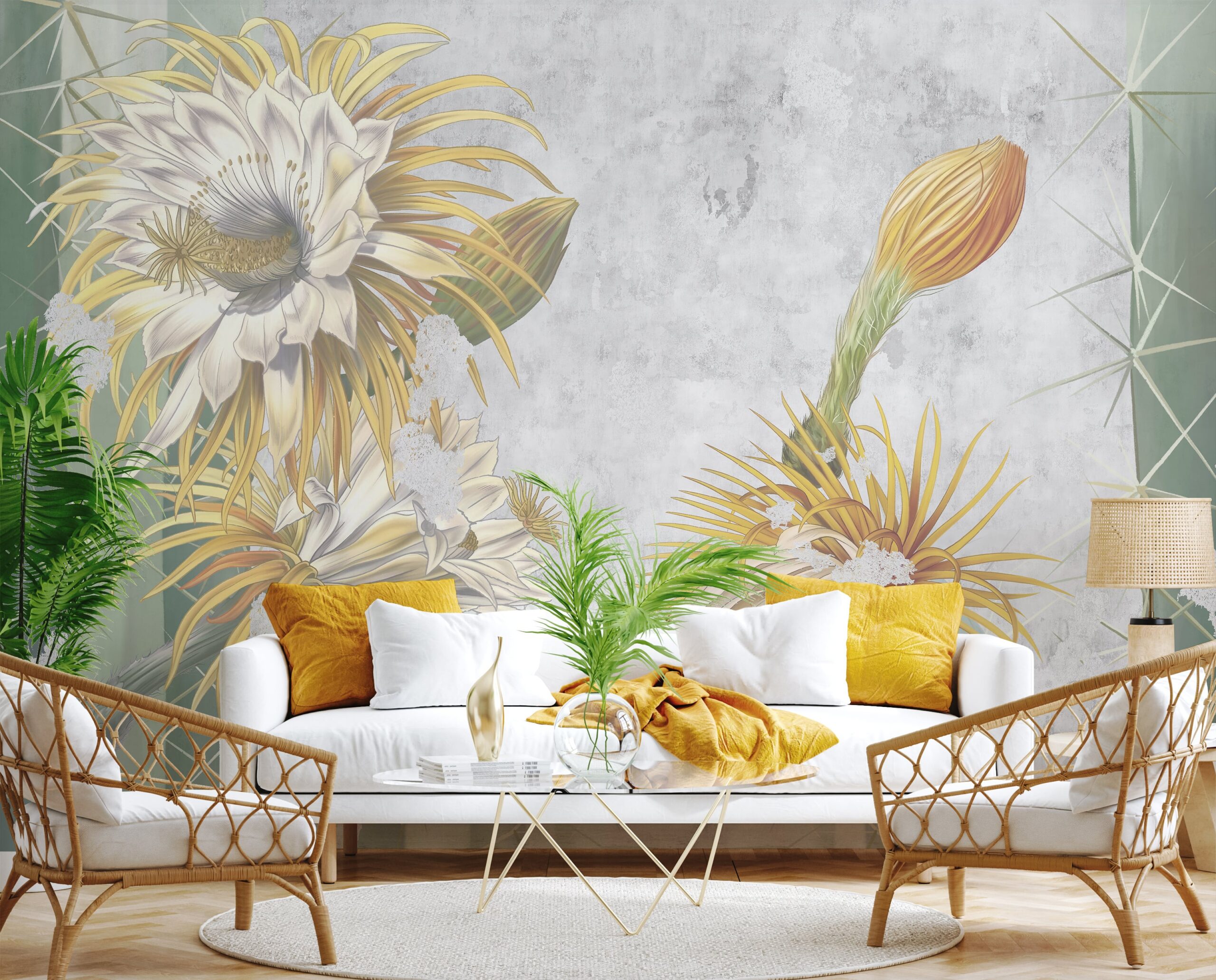 Breng een sfeer van rust en exotische schoonheid in uw interieur met de muurschildering “Desert Glow”. Dit unieke patroon toont bloeiende cactussen in een subtiele, artistieke interpretatie, waarbij gouden accenten, delicate details en gedempte achtergrondkleuren worden gecombineerd. De compositie, geïnspireerd op een woestijnlandschap, voegt lichtheid en een verfijnd karakter toe aan de ruimte.