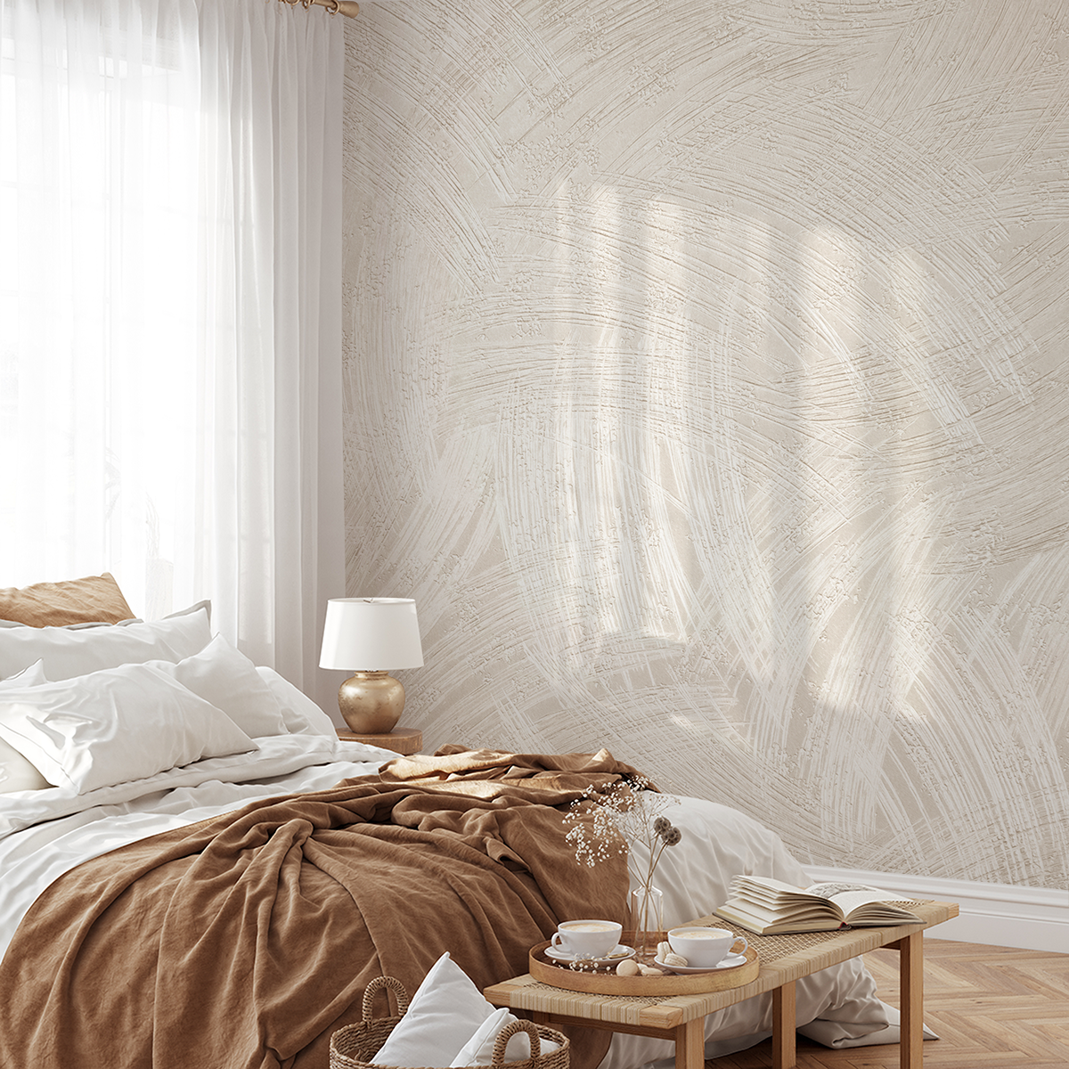 Breng een sfeer van serene rust in uw interieur met het “Desert Wind” fotobehang. Dit delicate, gestructureerde patroon in warme wit- en beigetinten lijkt op natuurlijke penseelstreken op stucwerk, waardoor een handgemaakt effect ontstaat. De moeiteloze elegantie en rustige kleuren passen perfect in zowel klassieke als moderne interieurs.