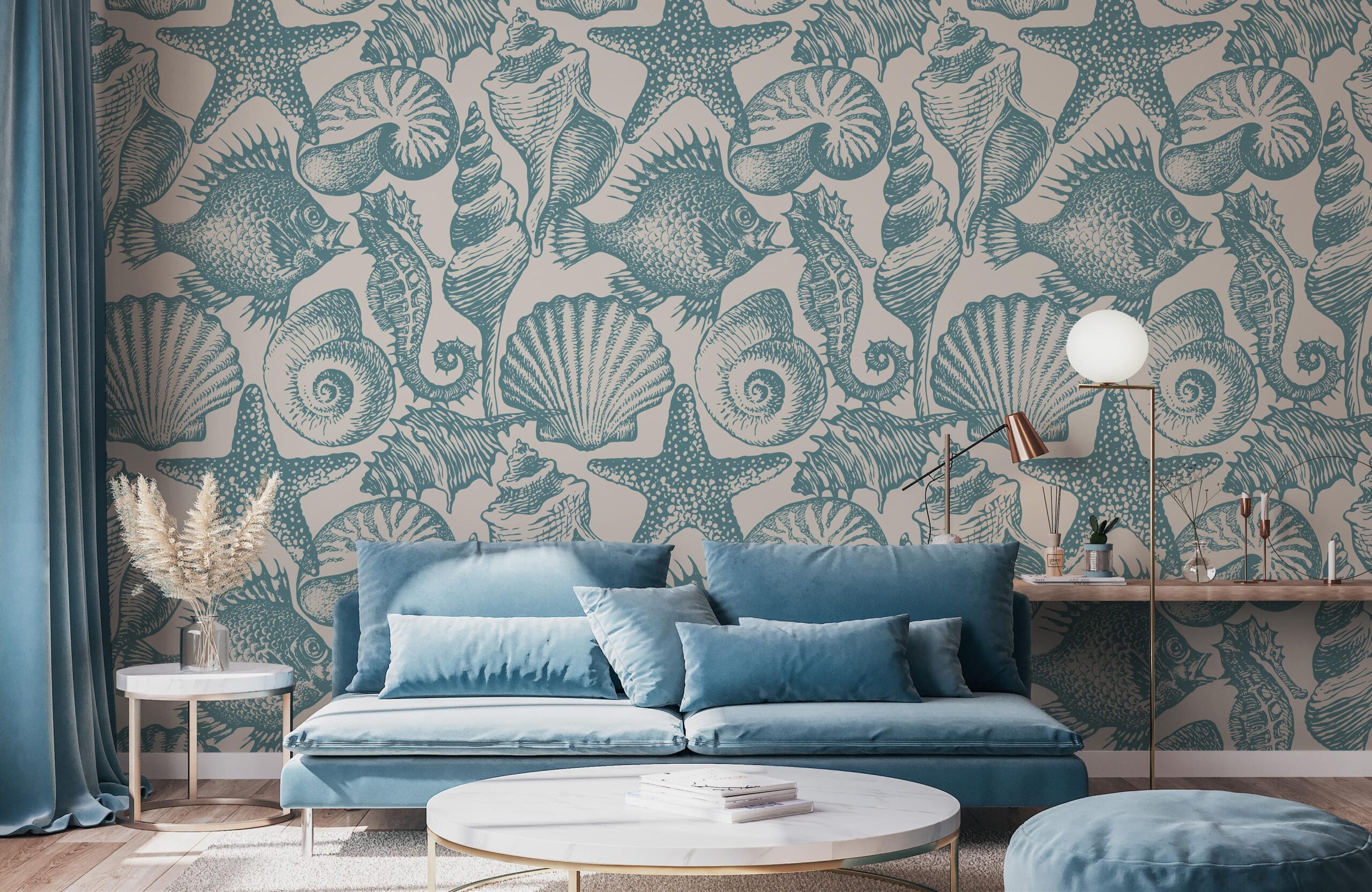 Breng een vleugje maritieme charme in uw huis met het “Sea Melody” fotobehang. Dit delicate, blauw-witte patroon, geïnspireerd op schatten uit de zee – schelpen, vissen, zeesterren en zeepaardjes – brengt een kalme en ontspannen sfeer in de ruimte. Het patroon, dat doet denken aan klassieke maritieme gravures, past perfect in diverse interieurs, van modern tot meer traditioneel.