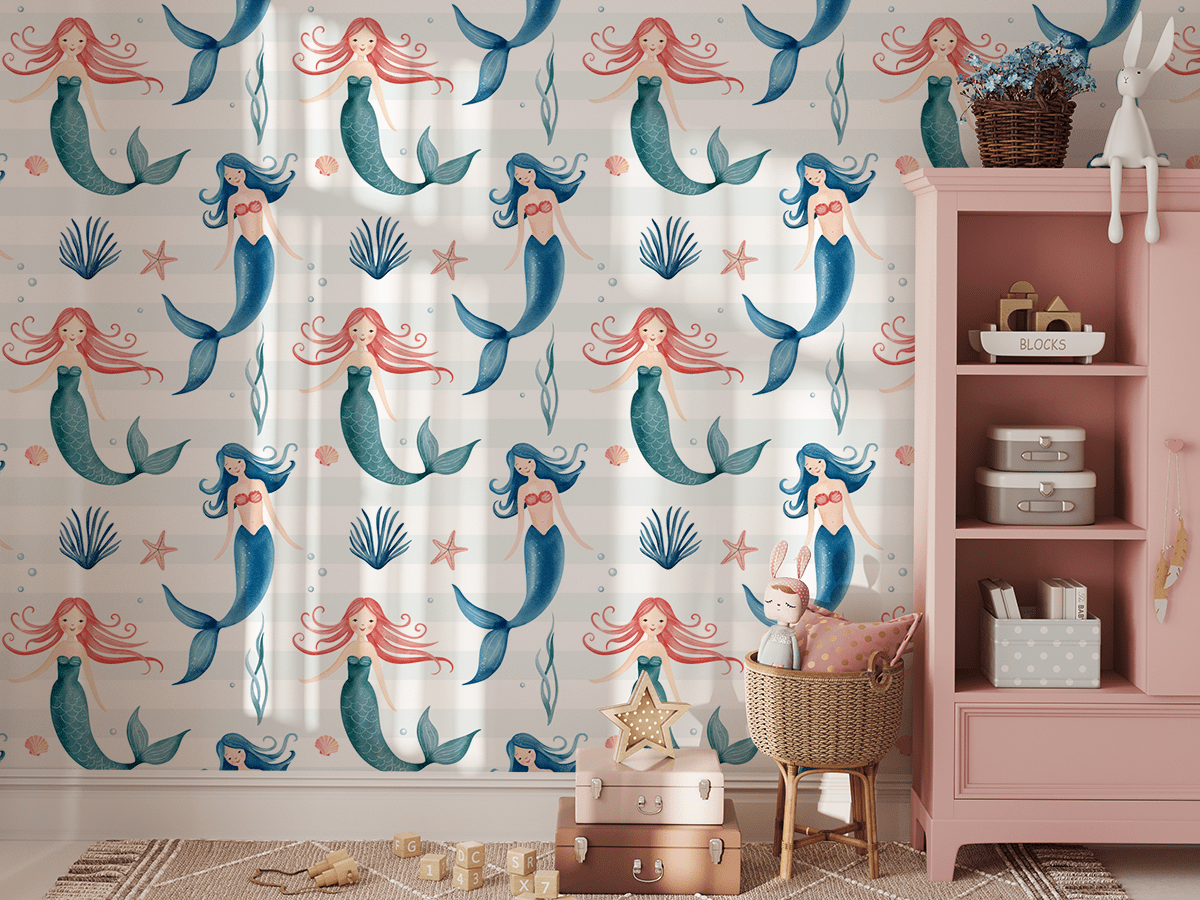 Verander de kinderkamer in een betoverend onderwaterland met het fotobehang “Zeeprinsessen”. Het charmante patroon met zeemeerminnen met kleurrijke staarten, schelpen en zeewier neemt de kleintjes mee naar een wereld van verbeelding, waar magie zich vermengt met de onderwaterwereld vol avonturen.