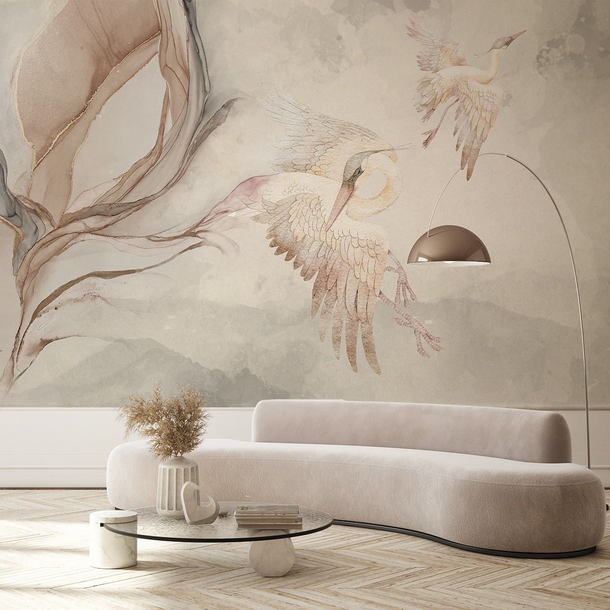 Breng een sfeer van rust en poëtische schoonheid in je interieur met het fotobehang ‘Romantic Birds’. Deze delicate aquarelcompositie met in de lucht zwevende vogels straalt lichtheid en harmonie uit. Subtiele beige, roze en grijze tinten creëren een rustige, bijna etherische achtergrond die perfect samengaat met de elegante, organische lijnen.